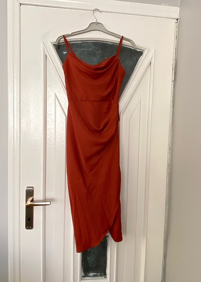 Turuncu kiremit rengi elbise 2-3 kez giyildi sol omuz askı ayarı kırıldığı için dikilip sabitlenmiştir ( fotoğraf ekledim) 36 bedendir içinde göğüs pedi vardır.Mezuniyet düğün kına vs için uygundur