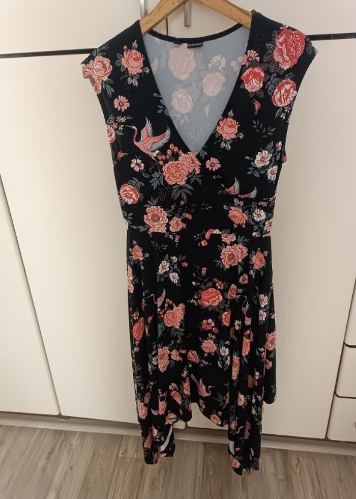 Desenli jarse kumaş eteği asimetrik elbise, esnek olduğundan 40-42 bedene kadar olur
