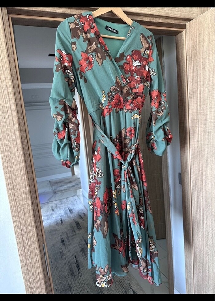 Yeşil kolları büzgülü midi boy elbise herhangi bir kusuru yok