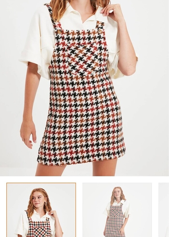 Mini dokuma ekose desenli jile elbise. Elbisenin sol tarafında fotoğraftaki gibi iki ip çıktı.