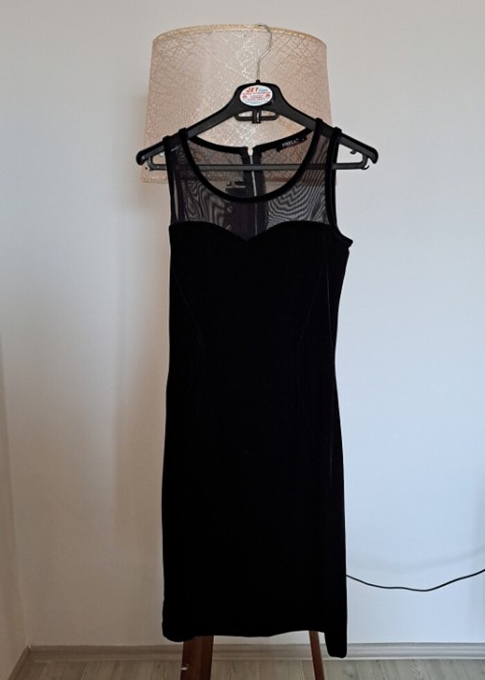 Siyah kadife transparan göğüs detaylı kalem midi elbise