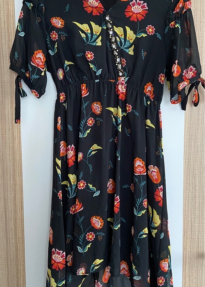 Kolları bağlama detaylı, önü kısa arkası uzun, taş detaylı elbise