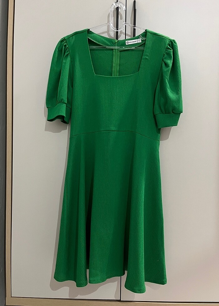 Kare yaka sırttan fermuarlı karpuz kol diz üstü elbise. Hiç giyilmemiştir