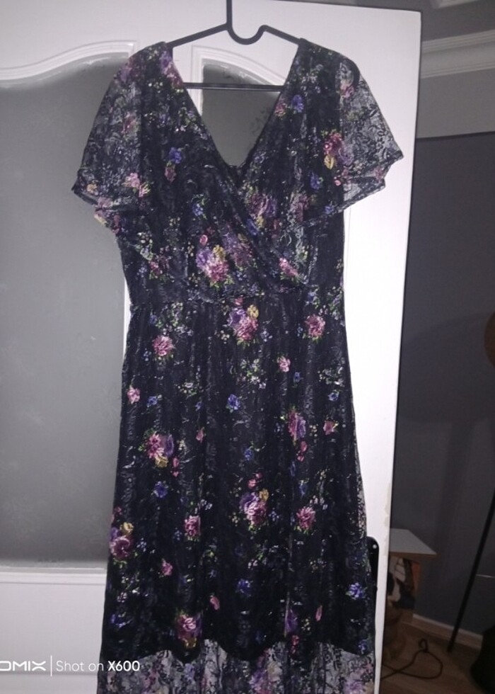 İçi astarlı üstündeki çiçekli güpür kumaşı. Omuzları açarak ta giyilebilen çok şık bı elbise