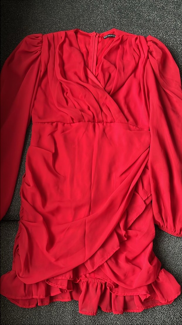 Kırmızı, v yakalı, uzun kollu ve drapeli tasarımlı bu midi elbise, gösterişli romantik akşamlar için uygundur. ✨