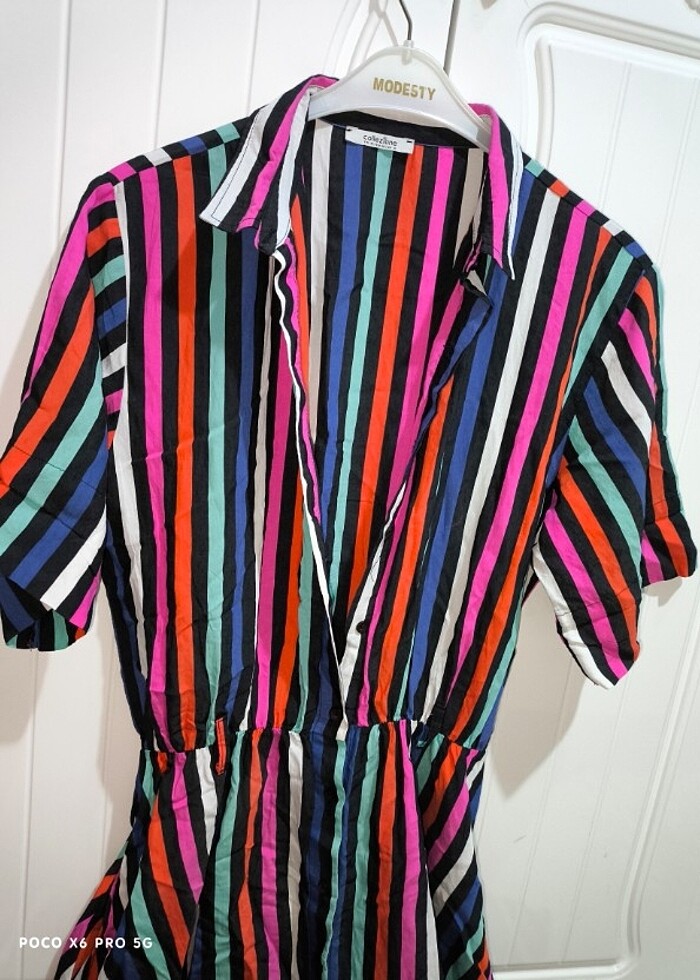 Renkli yazlık elbise hiç göstermez çok rahat beli lastikli cepli kısa kollu tiril tiril çok şık duruyor