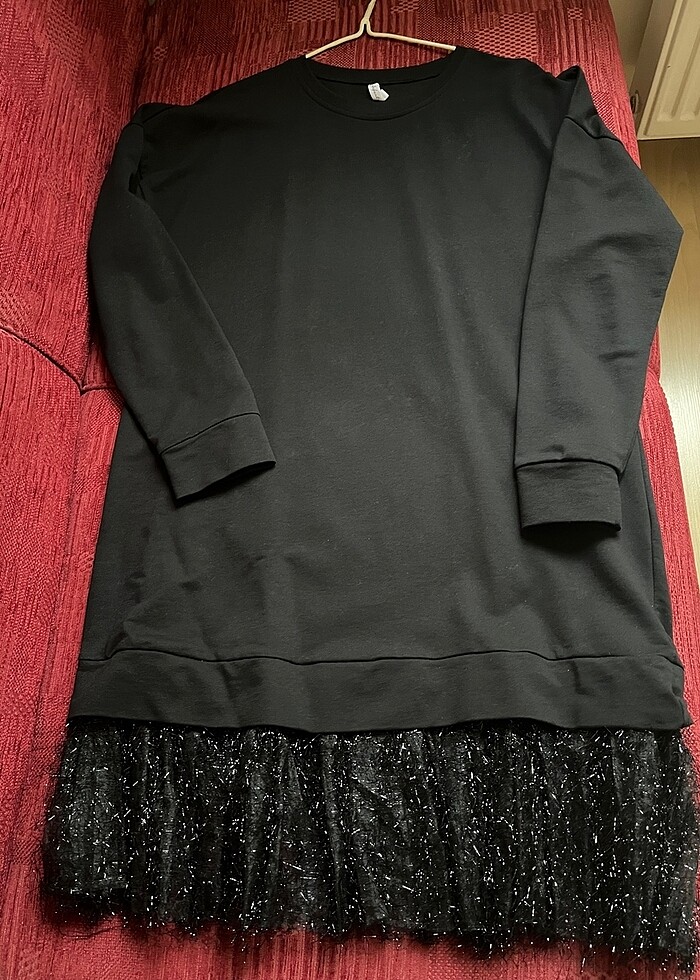 Eteği tütülü, ister elbise ister sweatshirt olarak giyilebilir, boy 90 cm, koltuk altından 55 cm, temiz