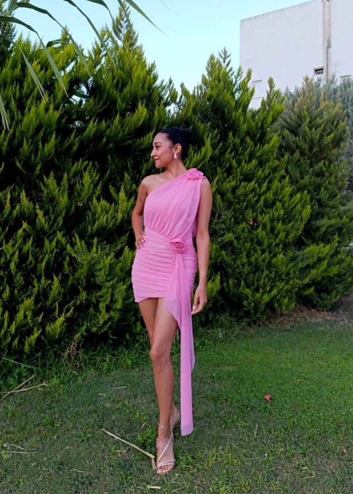 Tek omuz, gül detaylı pembe mini elbise. 1 kez kullanıldı.