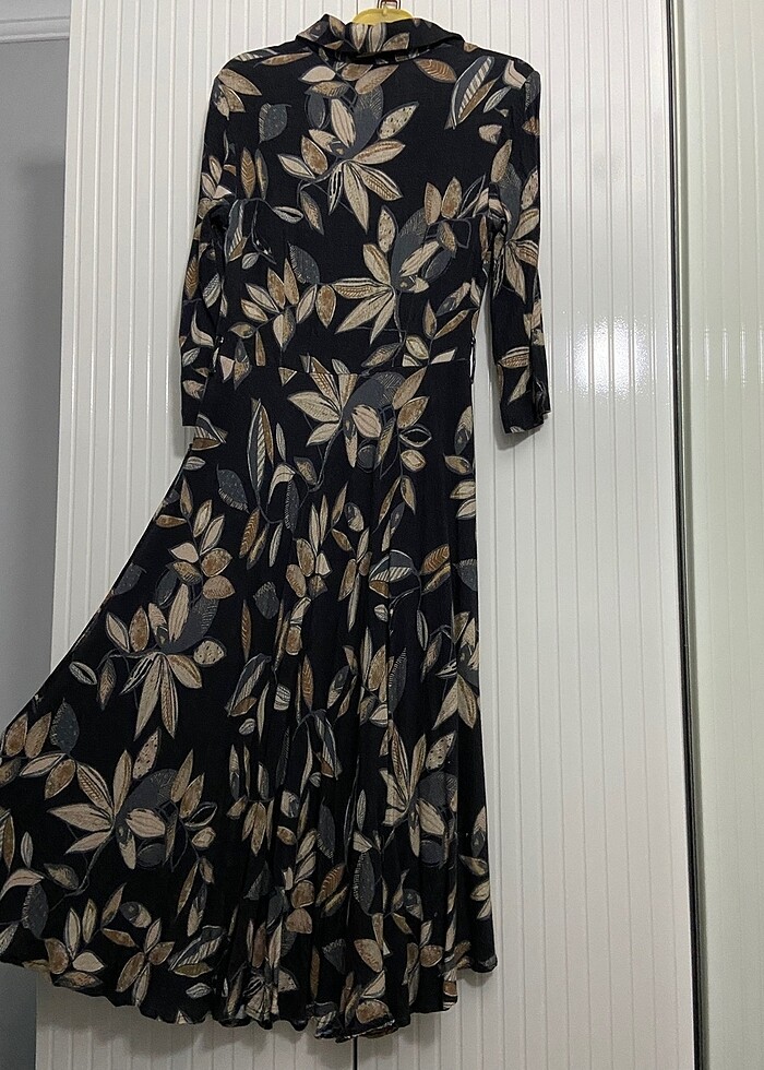 Kemerli çiçek desenli midi boy elbise. Önden yarım düğmeli yandan kolay giymek için fermuar var. Birkaç kere giyildi. Çok iyi durumda.