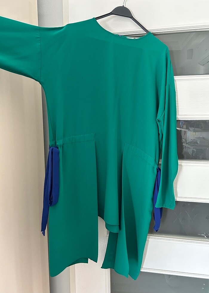 Yeşil mavi detayları olan elbise fazla uzun bir model değil tunik olarakta kullanılabilir