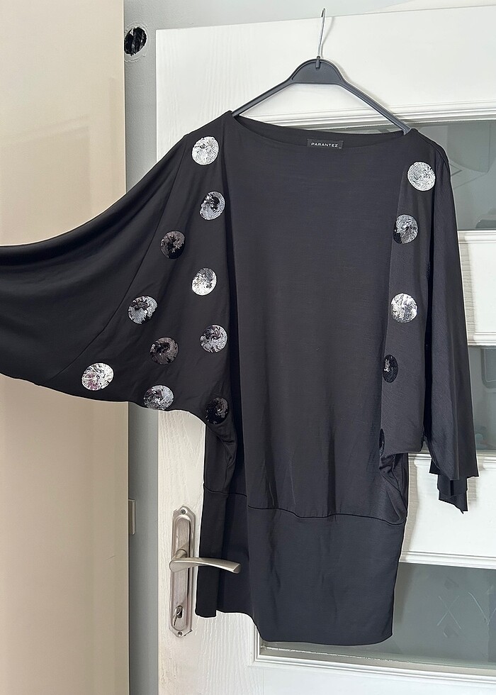 Siyah yuvarlak pul detaylı yarasa kol modeline benzeyen elbise