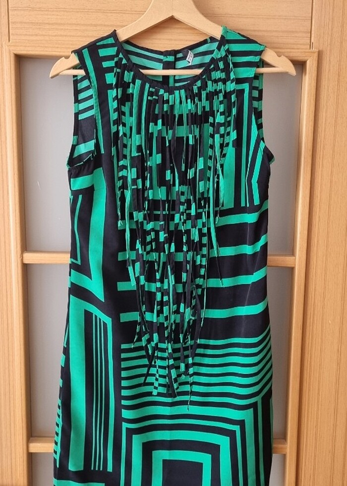 Önü püsküllü, sırt kısmı bele kadar düğmeli elbise Etek kısmındaki dikişleri görünmektedir, fotoğraflara eklenmiştir. 350 TL tutarında alışveriş yapılırsa hediye olarak gönderilecektir.