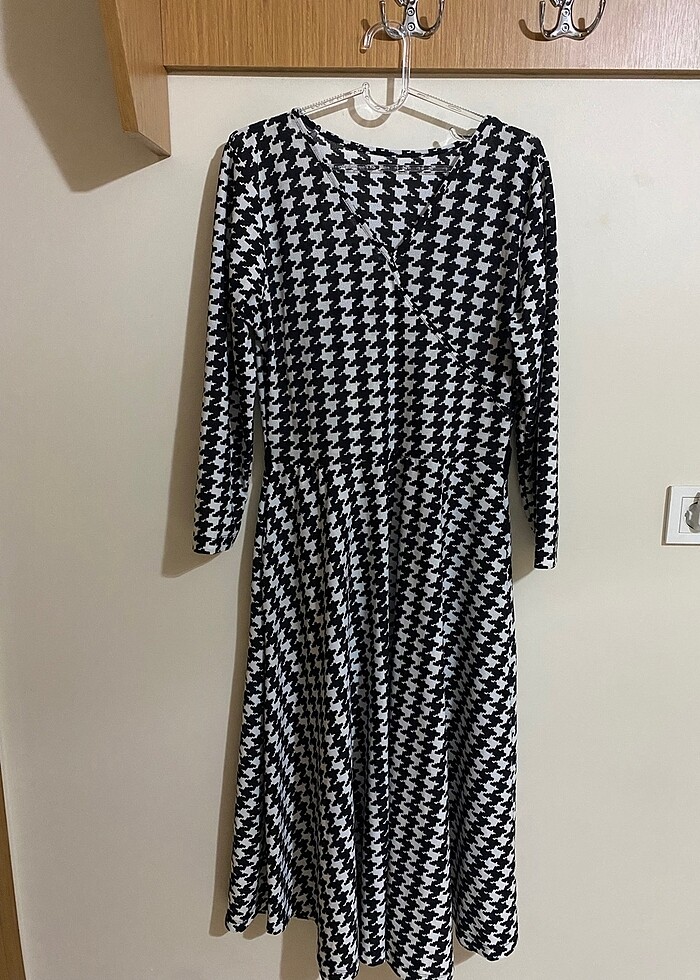 Likralı kumaş elbise. Bel 42 cm iki kol arası 46 cm. Kol boyu 50 cm. Tam boy 117cm.
