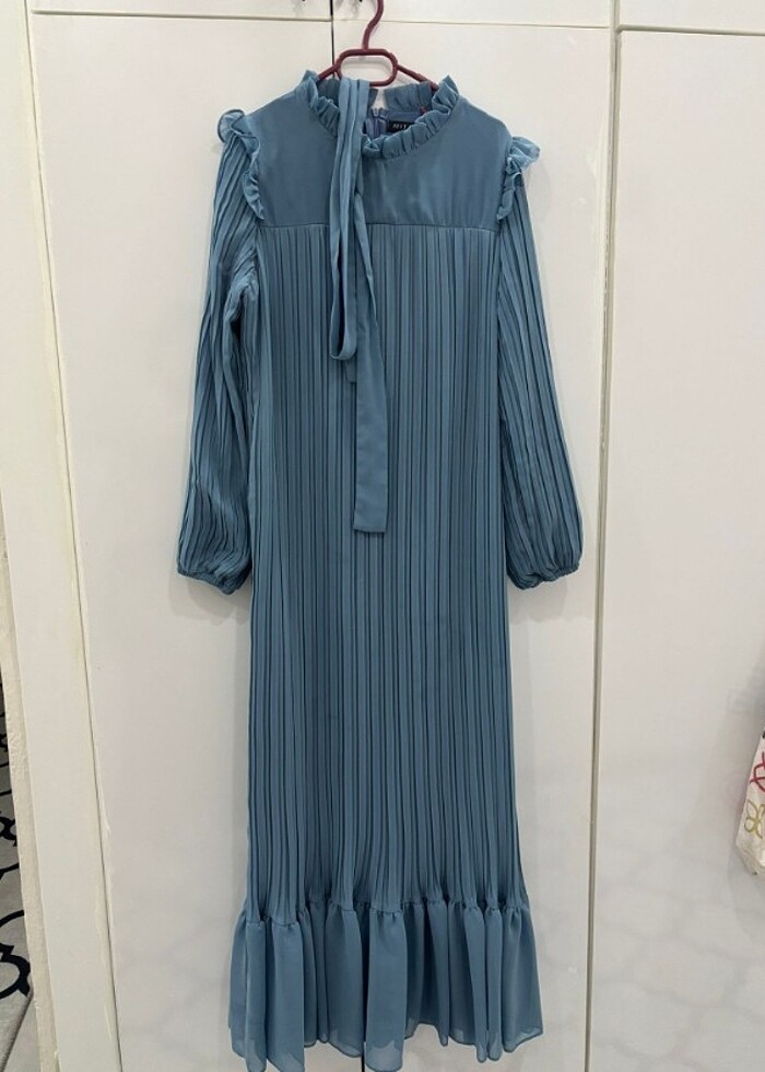 Uzun şifon fırfırlı elbise esnek yapısı olduğu için rahatlıkla kullanılır kalıbı geniştir 1 kez giyildi mevlutte bir kaç saat alıcısına şimdiden hayırlı olsun sadece ön tarafında yağ lekesi var hafif onun için uyguna veriyorum.