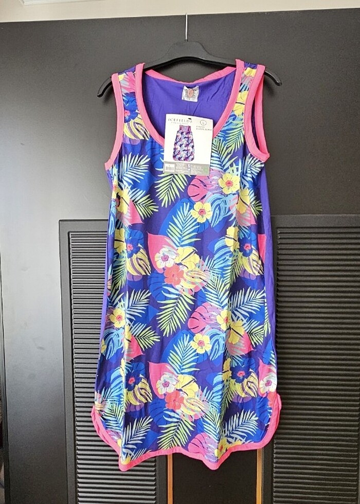 Yazlık penye elbise, plaj da da giyilebilir, etiketli sıfır ürün Arkası düz mor renktir.
