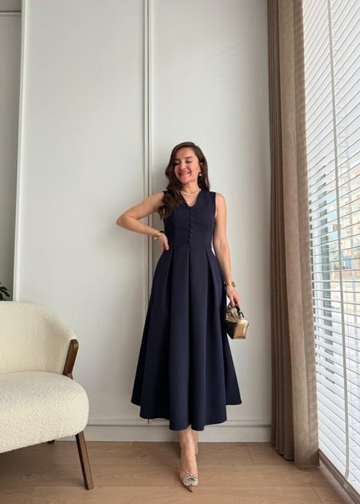 Lacivert V Yaka Düğme Detaylı Midi Boy Elbise. S, L bedenleri mevcut