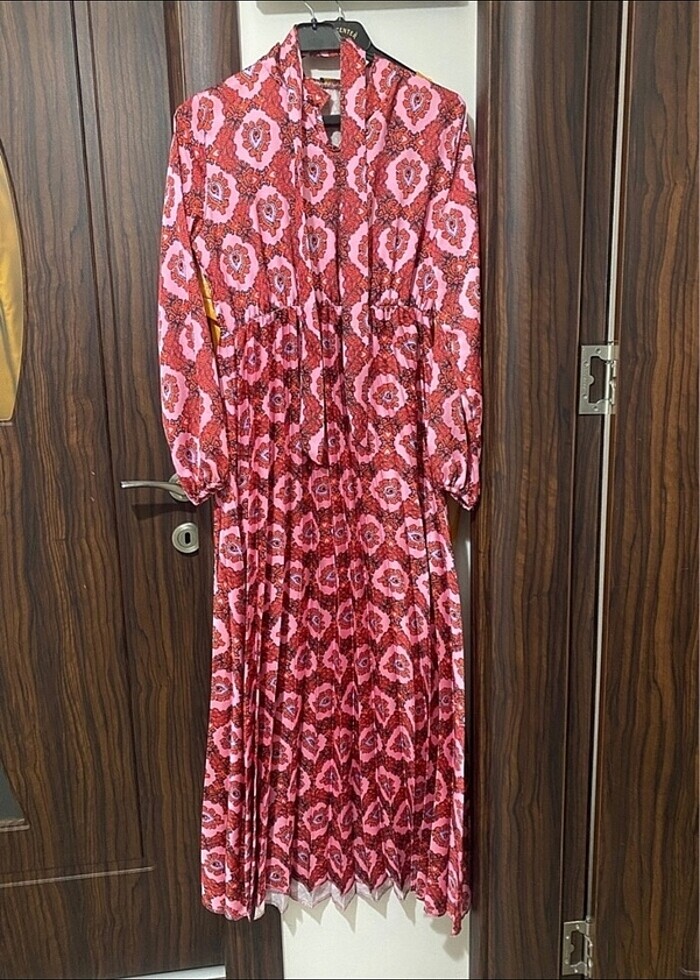 Hiç giyilmedi Belden büzgülü 36 beden bence 38 e de olur Pileli Görselde belirttiği kumaştan kaynaklı deforme boyun kısmına takıldığı için görünmüyor