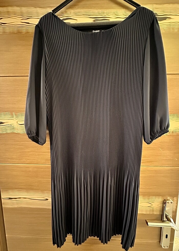 Lacivert, pileli, hat belli etmeyen elbise. Kolları tül ama kendisi normal iç göstermez. Az giyilmiş, 38 Beden, geniş bedendir.