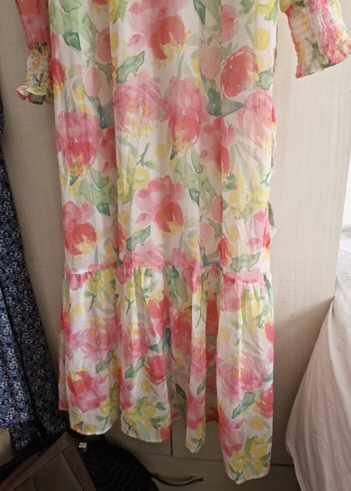 Yazlık cıvıl cıvıl elbise . Severek giydim ama sayılıdır. İnce uçuş uçuş çok tatlı bir elbise . Kolları astarısız amanben kullukla ya sa uzun kollu badi ile kullandım çok da güzel oluyor . Taşınacağım için satmak zorundayım. Alıcısına hayırlı olsun.