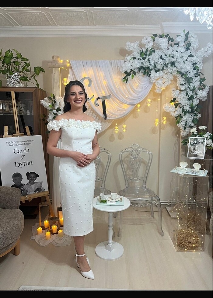 Söz veya nikah elbisesi olarak kullanılabilir ben sözümde giydim.Sadece 1 kez giyildi özel işlemeleri mevcut :) 5.000 liraya aldım . pazarlık payı mevcuttur Kırık beyaz
