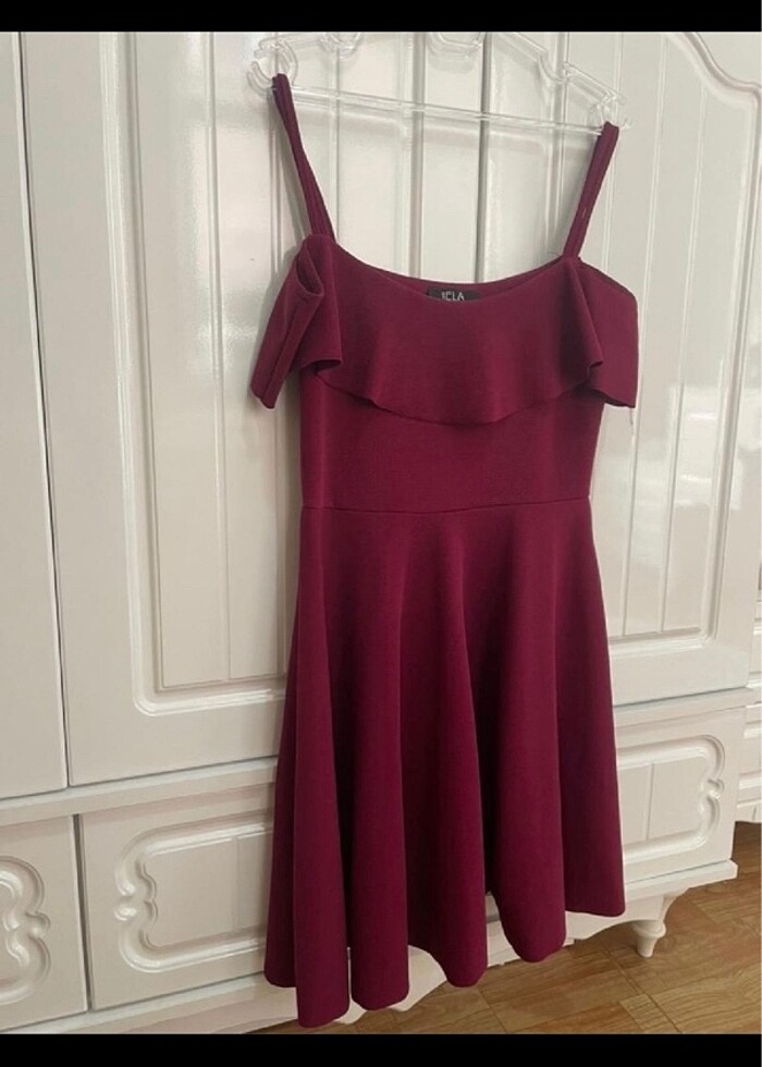 Bordo elbise. Kısa olduğu için giymiyorum. L xl m hepsine olur likralı göbek göstermiyor.