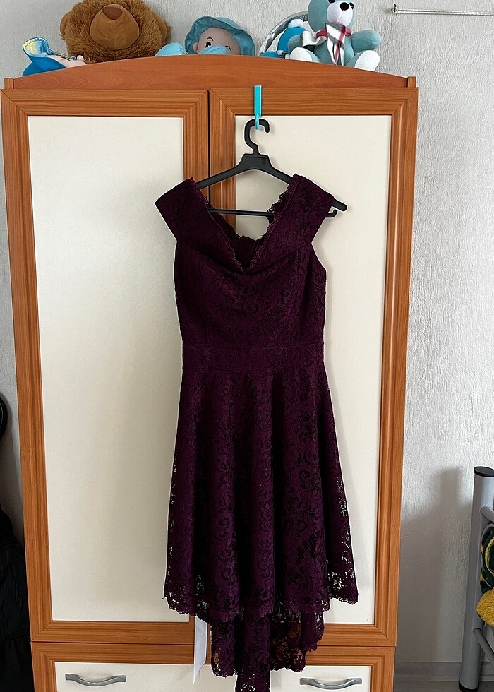 Önü kısa arkası uzun kesimde bir elbisedir. Kol kısmı kayık . 38 beden olup 36 bedene düşürülmüştür. Terzi payı kesilmemiş içine katlanmıştır. istenilen durumlarda tekrar açılıp 38 beden olabilir. Markası yoktur abiyecilerden alınmıştır. rengi kumaşı dantel kesimlerinde hiçbir problem yoktur. Rengine bayılarak almıştım kilo problemim yüzünden satmak durumundayım:(