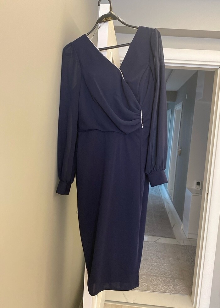 Kolları tüldür önünde hafif yırtmacı vardır diz altı elbise sadece bir kere giyildi