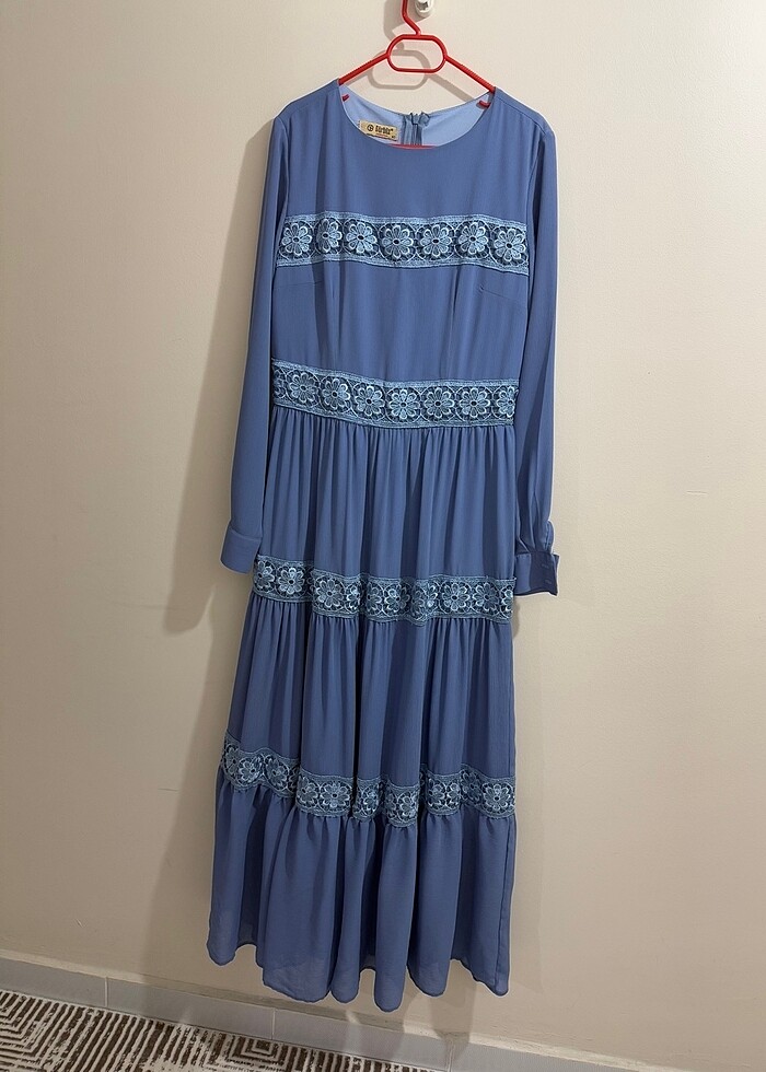 Elbise görselde ki şekildedir. Bir yerinde bir şey yok sadece fermuar kısmına denk gelen çiçek deseni nedeni ile biraz zor kapanıyor