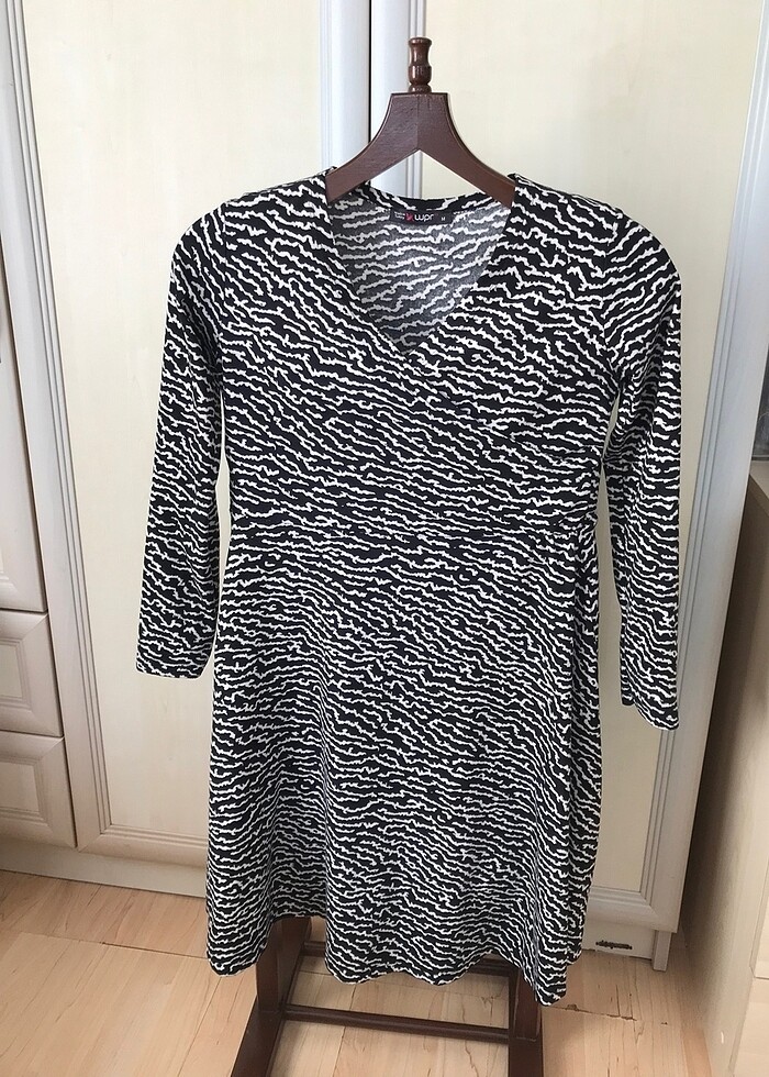 Kruvaze yaka yumuşacık dokulu, zebra desen mevsimlik kışlık sayılabilecek elbise bir iki kez kullanıldı çok temiz durumda 38/m beden uyumlu uzunluğu omuzdan itibaren 90 cm iki koltuk arası genişlik 43 cm esnek yapıdadır 38 bedene büyük göğüs dışında çok rahat olur