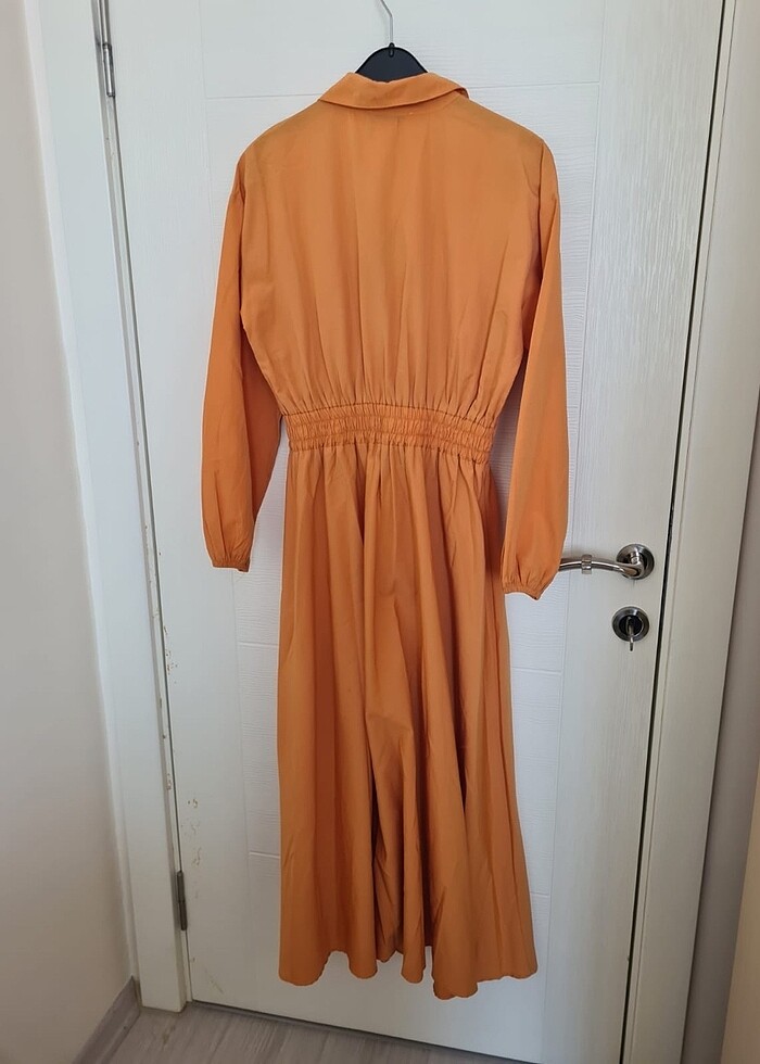 Mango renkte, uzun kollu, düğmeli ve yakalı bol kesim kadın elbise. Yumuşak poplin kumaştan, bel kısmı büzgülü, bohem tarzda günlük kullanım için uygun. Beli oturmalı model. Bel altından itibaren diktirdim düğmeler açılıyordu. 2 beden 80 kiloya kadar uyar beliniz alt bedeninize göre inceyse. Boyu 129 cm. #mango #yazlık #elbise