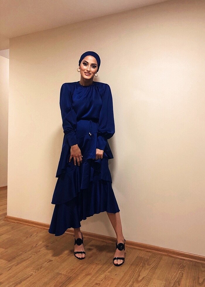 1 kere giydim saten şık bir elbise lacivert renkte