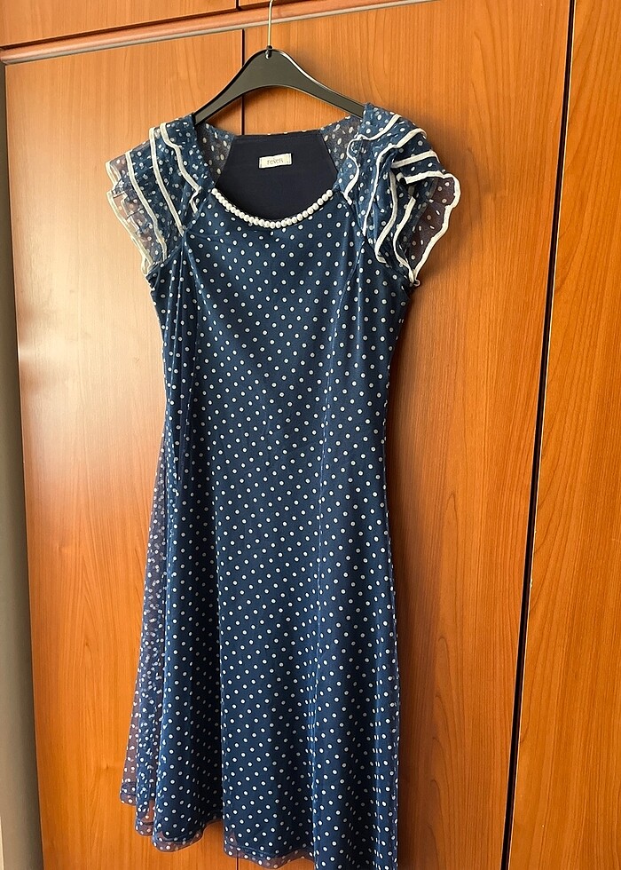 İçi jarse kumaş olup,dış kısmı puantiyeli tülden yapılmış bir elbisedir.Yaka kısmında ve kollarda şık detaylar mevcuttur.Beden küçüklüğünden dolayı satıştadır.