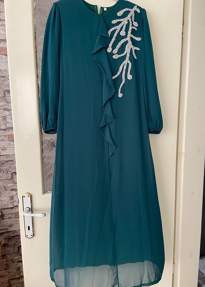 Ürün sadece bir kez giyilmiştir. Zümrüt yeşili şifon elbise içi astarlı omuzunda taş işleme detayı vardır. Elbisede hiç bir deformesi yoktur. 42-44 beden tercih edebilir