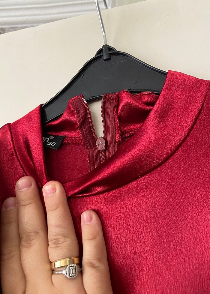 Koyu kırmızı bordoya yakın bir renktir saten ince bir saten değildir kuşağı vardır Çan inmektedir omuz detayı ile şıklık katmaktadır 36 bedendir sadece bir kez giyilmiştir