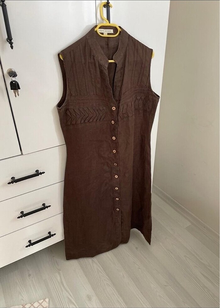 Keten elbise boyu 108 cm iki kol arası 48 cm 42 beden çok az kullanıldı yepyeni duruyor hiç bir sıkıntı ve defosu bulunmamaktadır