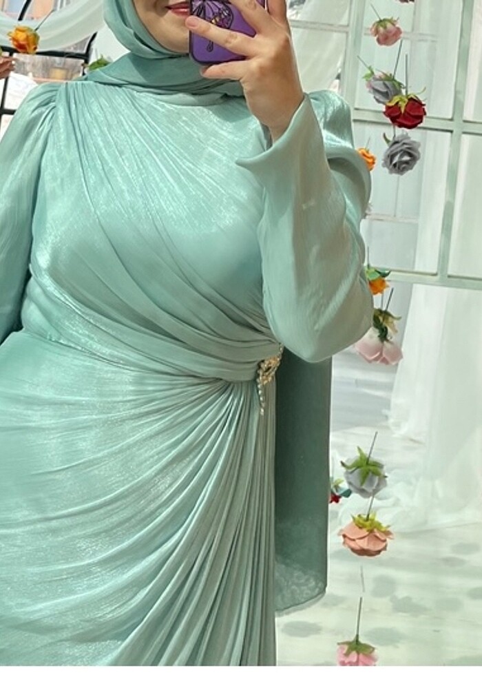 İki defa giyildi. 40 beden. Kuru temizlemesi yapıldı. 2 metrelik şalı ile beraber göndereceğim herhangi bi defosu yok . Elbise dik yaka