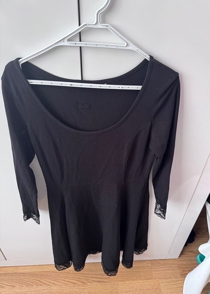 Kol ve etek kısmında dantel detaylı siyah kısa elbise Elbise 36-38 arasıdır