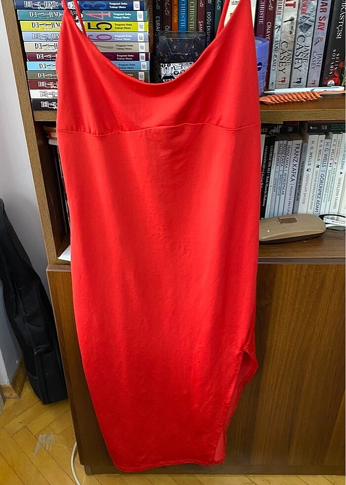 L beden açık kırmızı turumcusu Göğüs 79 cm Gövde 82 Boy omuzdan 116 Yırtmaç boyu 41 cm Yırtmaç sol tarafta