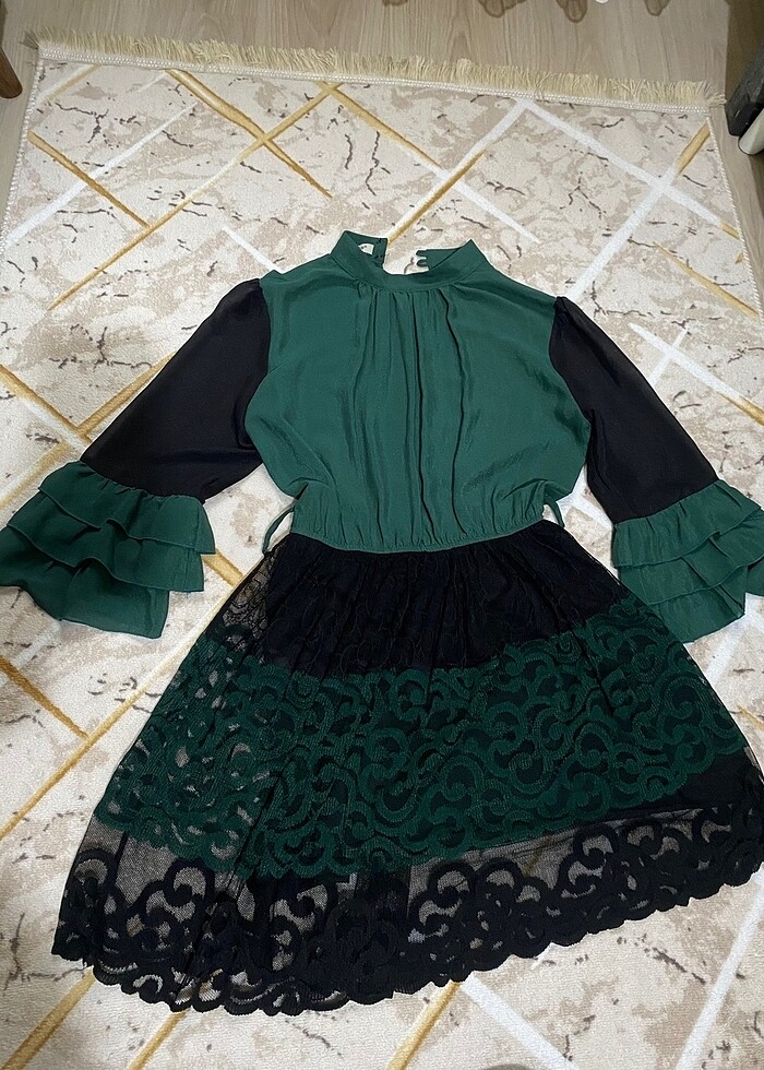 eteği dantelli haki yeşili-siyah elbise, kolları fırfırlı etek astarı vardır hiç bir sorunu yoktur
