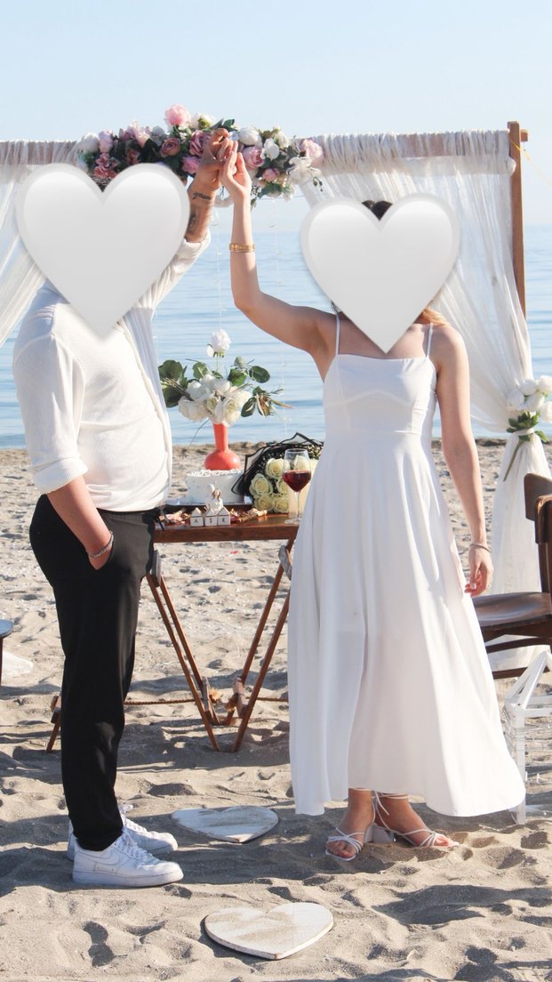 Askılı kolları ve straplez yaka detayıyla beyaz midi elbise minimalist bohem tarzda ve rahat kesimdir. Plaj düğünleri için uygundur.