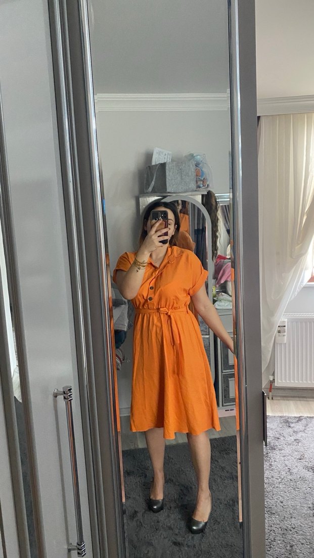 Turuncu renkte, yakalı ve kısa kollu midi elbise. Kemerli ve bol kesim, parlak ve ipeksi kumaştan, minimalist sokak tarzına uygun.
