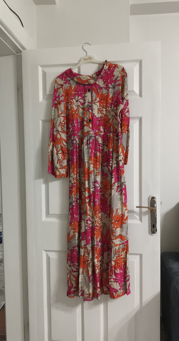 Renkli bağlamalı uzun elbise, bol kesim ve uzun kollu. Canlı tie-dye deseni ve düğmeli ön detaylı, sentetik kumaştan yapılmıştır.