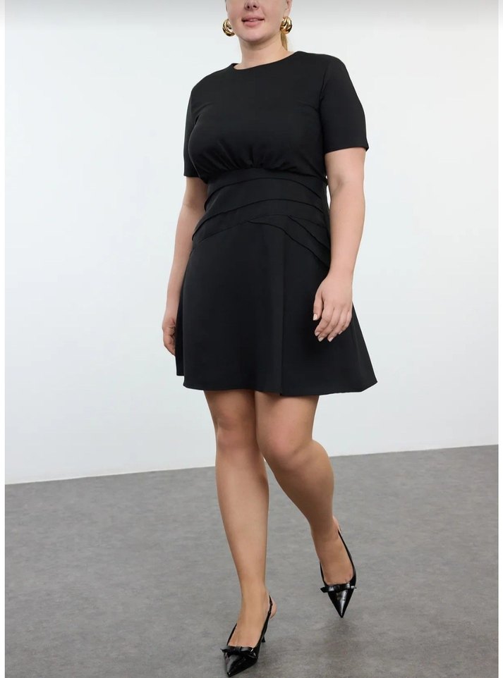 Siyah mini elbise, kısa kollu ve bisiklet yakalıdır. Düz, hafif esnek sentetik kumaştan, ofis için uygundur. ✨