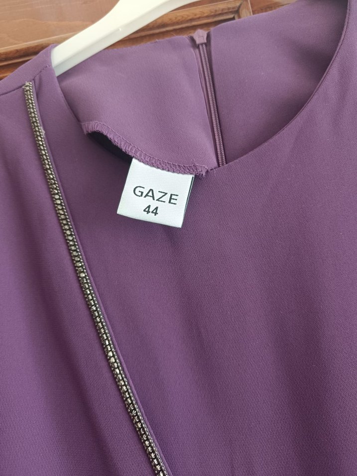 Mor renkli, fermuarlı, uzun ve bol kesim elbise ve yuvarlak yaka tasarımıyla düğünluk kullanıma uygundur.