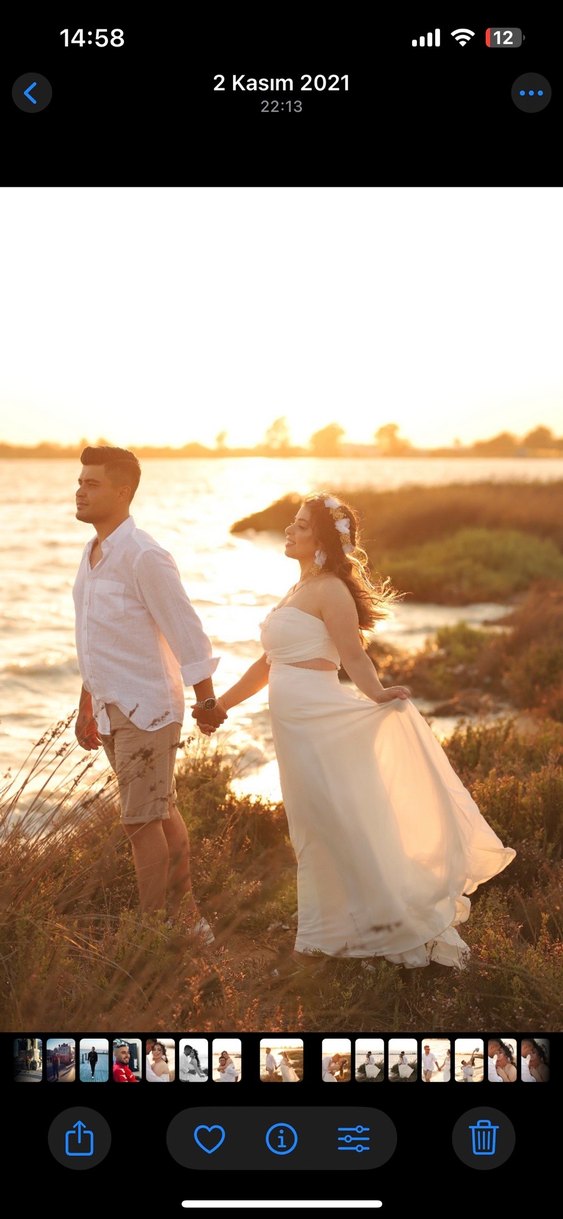 straplez uzun, akışkan etekli dış çekim elbisesi Dış çekimde giyilmiştir etek ucunda ufak bir deforme vardır