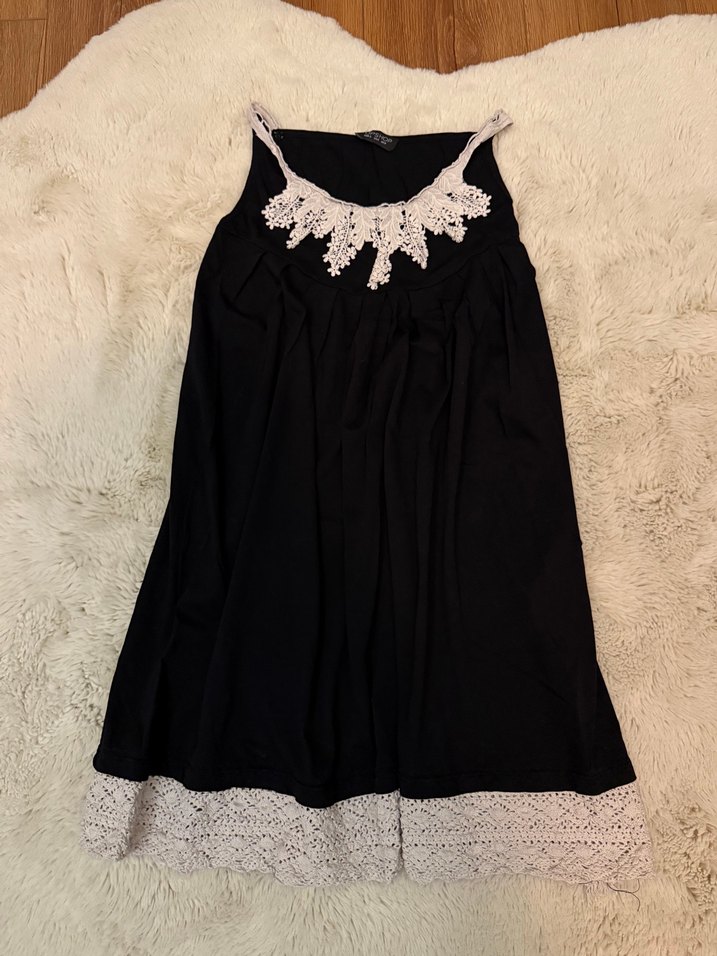 Nakışlı dantel detaylara sahip, askısız yaka ve kolsuz siyah elbise. Rahatlığıyla midi boyda ve bol kesim.