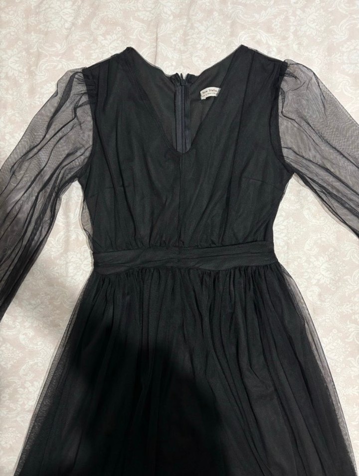 V yakalı, uzun transparan kollu ve drapeli, sentetik kumaştan yapılmış siyah, dar kesim gotik elbisedir.
