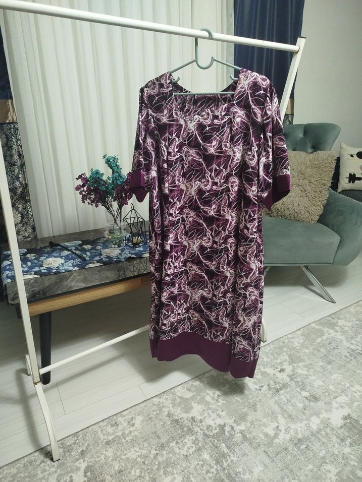 BOY 107 cm,,,İKİ KOL ARASİ 60 CM,,KOL OMUZDAN İTİBAREN 32 cm,,Mor bağlama desenli, drapeli, V yaka, kısa kollu, salaş kesim hamile tunik. İpek gibi dokusu ve midi boyuyla günlük kullanıma uygun.AŞAĞIYA DOĞRU GENİŞLEYEREK İNİYOR EN SON BİTİŞ 90 CM,, ASTARLI...