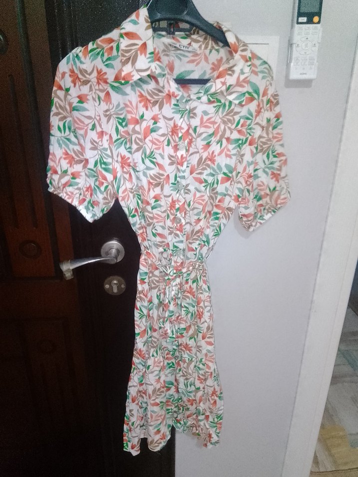 Kısa kollu, yakalı, bol kesim elbise, pastel çok renkli baskılı ve drapeli tarzda. iki kere giyildi tertemiz