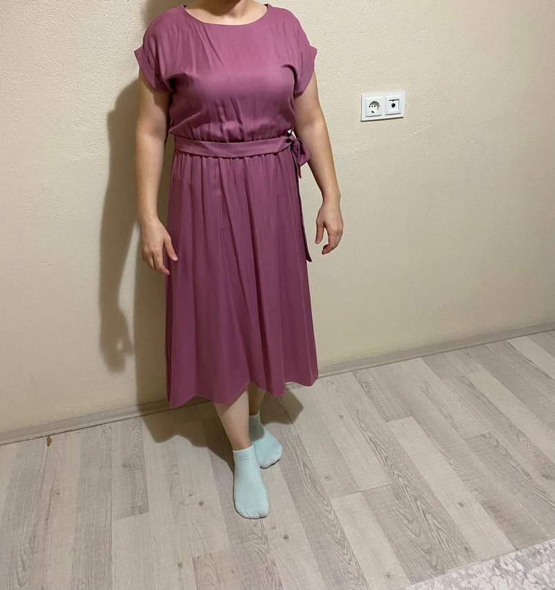 Mor renkte midi boy, salaş kesim elbise. Yuvarlak yaka ve ince askılı, yumuşak sentetik kumaştan, günlük rahat kullanıma uygun. Belde bağlama detayıyla şık ve rahat.